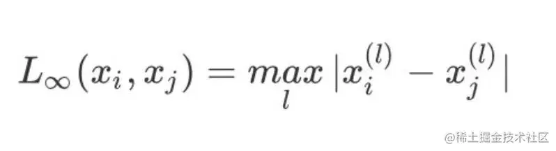 4、当p趋于无穷时,表示为切比雪夫距离,它是各个坐标距离的最大值: