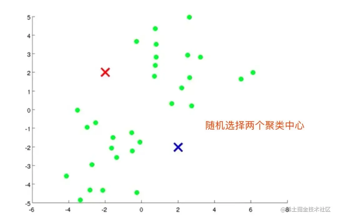 2、随机选择2个聚类中心(K=2)