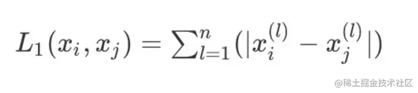 2、当 p=1 则表示为曼哈顿距离:
