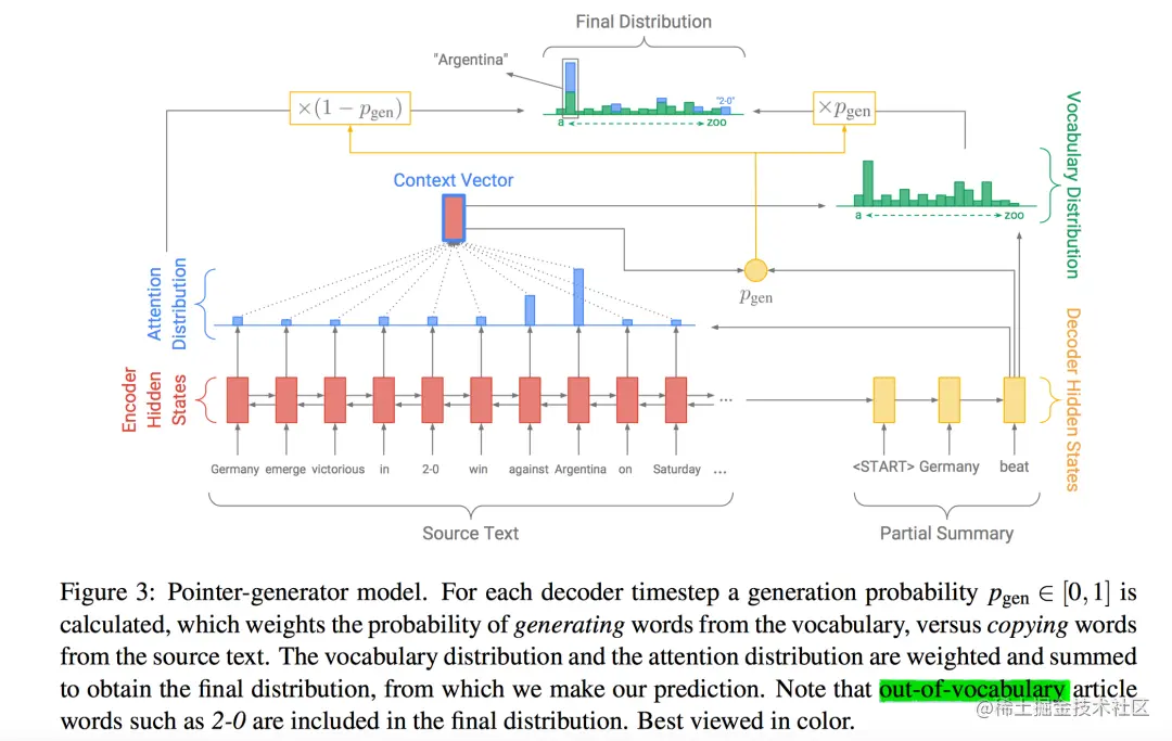 当然,直接这样操作未必会有好的结果,因此作者又加入了一个 来作为soft概率。Pgen的作用可以这样理解:决定当前预测是直接从源文本中复制一个词过来还是从词汇表中生成一个词出来,二者通过插值combine起来。