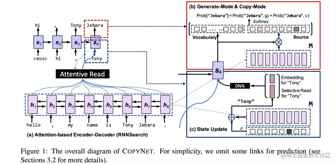 右侧下半部分,根据 , , , 更新此刻的Decoder状态 。重点是前一时刻输出词 (Tony)除了它的embedding之外,作者还考虑了如果前一时刻的输出词是输入序列某个位置的词,例如Tony就是输入序列的词,那么利用Attention向量对这些输入词的Encoder hidden state进行加权作为对输入序列的Selective Read(此处是Tony,但是Tony可能出现多次;如果没有出现,那么这部分为空,退化为传统的方法)。然后将Tony的Embedding和Selective Read连接在一起作为 。最后一起经过LSTM/GRU得到此刻的 。