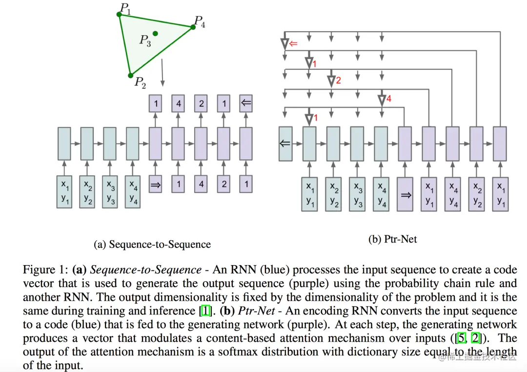 首先是“NIPS2015:Pointer Network“。作者想解决的是**「输出序列语句中每个元素是离散的单词,且该元素和输入序列语句中每个位置相对应」**的应用场景(an output sequence with elements that are discrete tokens corresponding to positions in an input sequence,说白了就是拷贝),如寻找凸包(比如训练的时候最多4个顶点,后来遇到10个顶点的几何图形就解决不了了)等。