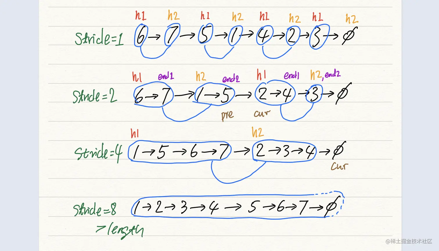 - 细节处理:当链表长度无法被strtide整除,那么最后一组的长度肯定小于stride,getStrideEnd()中注意实现。
