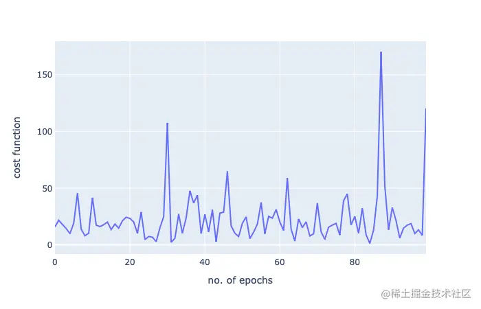 然而,由于其随机性,随机梯度下降并不像批量梯度下降那样具有平滑的曲线,虽然它可以返回良好的参数,但不能保证达到全局最小值。