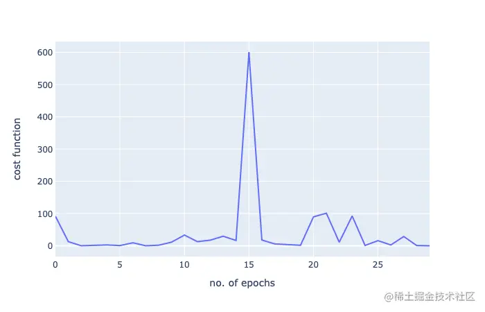 哇!我们从592到29,但是请注意:我们只进行了30次迭代。批量梯度下降,500次迭代后得到27次!这只是对随机梯度下降的非凡力量的一瞥。