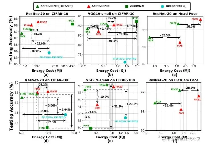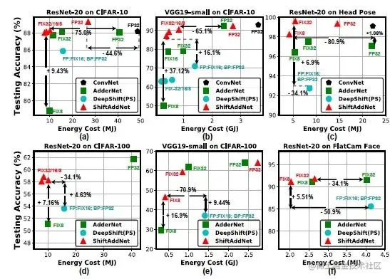 我们可以发现量化为FP-8的ShiftAddNet的精度相比于FP-32的AdderNet的变化为-1.79%-0.18%,但是节约了65.1%-75.0%的能耗;量化为FP-8的ShiftAddNet的精度相比于DeepShift的变化为2.41%-16.1%,而且节约了34.1%-70.9%的能耗。作者同样对比了在相同的量化精度下(FIX32/16/8)ShiftAddNet的精度和能耗都优于DeepShift和AdderNet。
