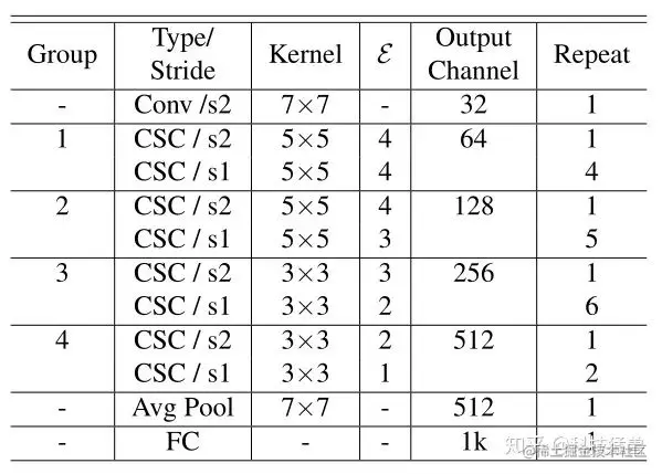 如下图8所示为ShiftNet-A的结构,因为参数量并不会随着Shift kernel size的增长而变大,所以在一开始的module里面使用了比较大的卷积5×5。通过调节expansion rate 来改变每个CSC module的参数量。下图所示的结构为ShiftNet-A。若把每个CSC模块的channel数变为原来的0.5倍,即得到ShiftNet-B的结构。若在group 1,2,3,4中分别使用{1,4,4,3}个CSC module,channel数分别为{32,64,128,256},expansion rate ,kernel size为3,则得到ShiftNet-C的结构。