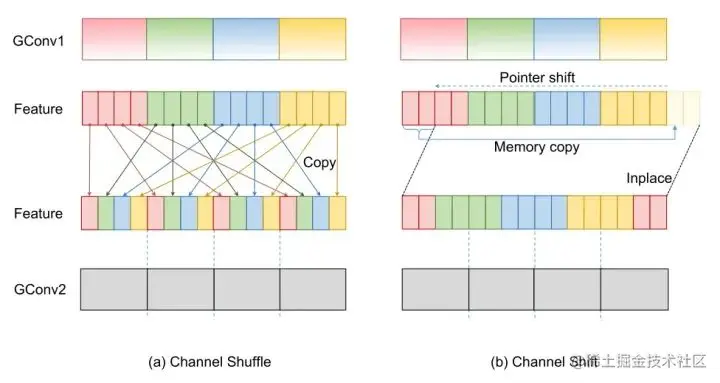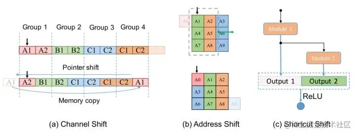 Shift操作因此诞生。它的最大特点是:requires zero FLOPs and zero parameters。这个特点能够同时满足上面的2个要求。这样,Shift操作维持了computation/memory access这个比值,从而能够很容易地在硬件设备上实现。