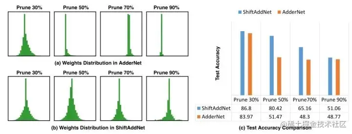 我们可以看到,原始的加法网络,即AdderNet,在高剪枝率下不能为权重提供宽的动态范围(权重分布的范围变窄了,但是ShiftAddNet权重的分布范围还是依旧很宽),而ShiftAddNet可以保持一致的宽动态范围的权重。这解释了ShiftAddNet对稀疏化的鲁棒性的提高。图41(c)中的测试精度比较表明,当剪掉add layer层中50%的参数时,ShiftAddNet仍然可以达到80.42%的测试精度,而原始AdderNet的精度下降到51.47%。