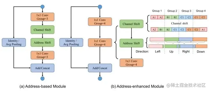 一个卷积核在每一个channel上面有 种可能的shift directions,再假设有 个channel,所以共有 种可能的shift选择。显然,在这样的空间里暴力搜索出最适合的shift选择是不现实的。所以作者使用了近似的手段,即:把这 个channel分成 组,我们将每个组称之为平移组(shift group)。那么每组的 个channel使用相同的shift选择,采用相同的平移方向。当然,有可能存在除不尽的情况,这个时候将会有一些通道不能被划分到任意一个组内,这些剩下的通道都称之为“居中”组对输入按通道数进行分组, 每一组通道只往一个方向平移。