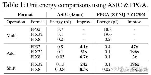 首先我们比较一下在ASIC和FPGA上面,不同的数据格式 (Format)的不同操作 (Operation):乘法,加法和Shift操作的能耗 (pJ):