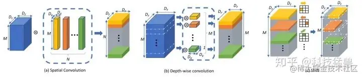 图1:Shift操作与常规卷积和深度可分离卷积的对比