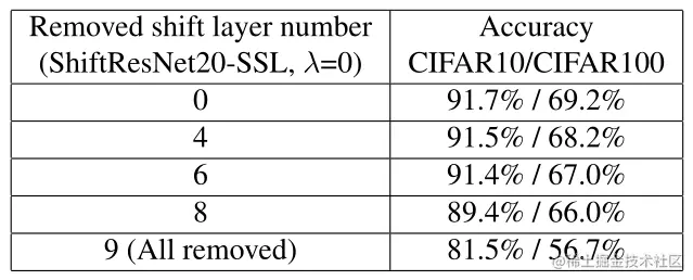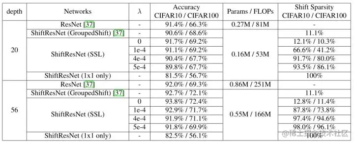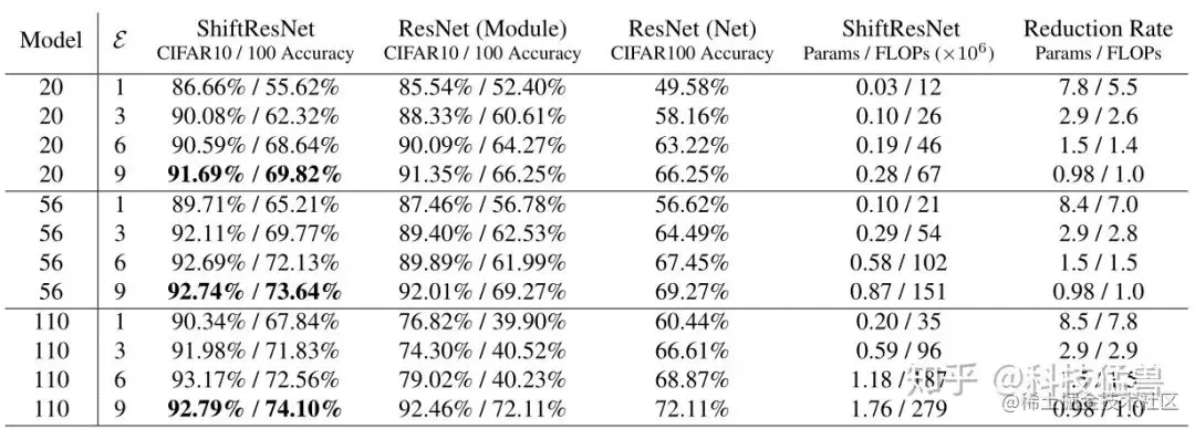 下图7展示了3个模型 (ResNet20,ResNet56,ResNet110)的不同参数量 (expansion rate=1,3,6,9)时在2个数据集 (CIFAR-10,CIFAR-100)上的实验结果。Shift算子的确在计算量和参数量上有着比较大的优势。比如说当我们控制参数量或计算量下降8倍左右时,即每组的第一行,那么常规ResNet的性能会大幅地下降,而ShiftResNet的性能下降幅度较小。