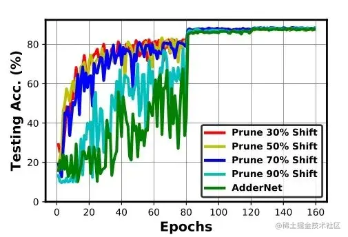 作者也对ShiftAddNet中的Shift层进行剪枝,对比不同的剪枝率下的ShiftAddNet的性能,如下图40所示。当剪枝率达到100%时,ShiftAddNet退化为AdderNet。我们可以发现,即使在Shift层被大幅删减的情况下,ShiftAddNet仍能保持其快速收敛的优势。