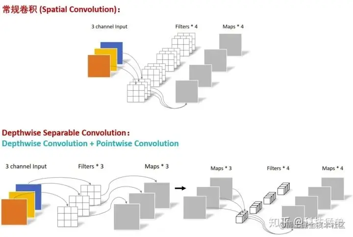 CNN主要依赖卷积 (Spatial Convolution) 来聚合图像中的空间信息。在神经网络中,卷积核是卷积操作最核心的部分,它也叫滤波器,接收这一层的输入Input,计算出这一层的输出Output。卷积网络计算密集,且模型变大的原因是卷积核引入了高强度的计算量,且使模型参数量急剧上升。在这样的背景下,研究者们设法减少卷积核的大小,进而减少模型的计算量和参数量。其中比较著名的是Depthwise Seperable Convolution,即深度可分离卷积。如下图所示,图中对比了深度可分离卷积和常规卷积操作的不同: