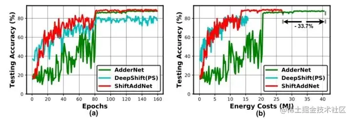 如下图38所示为ShiftAddNet与DeepShift和AdderNet的训练曲线,根据结果可以得出结论:ShiftAddNet以更少的时期和能量成本实现了相当或更高的精度,这表明它具有更好的泛化能力。