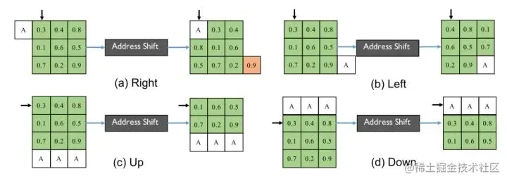 我们发现,如下图3所示,shift卷积过程相当于将原输入的矩阵在某个方向进行平移,如图3所示。这也是为什么该操作称之为shift的原因。虽然简单的平移操作似乎没有提取到空间信息,但是考虑到我们之前说到的,通道域是空间域信息的层次化扩散。因此通过设置不同方向的shift卷积核,可以将输入张量不同通道进行平移,随后配合1x1卷积实现跨通道的信息融合,即可实现空间域和通道域的信息提取。