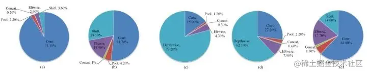 图(a)和(b)展示了在ShiftNet(上一小节讲的模型)中,Shift操作分别在在这两类设备上的运行时间(Runtime)的占比,我们发现,Shift操作在CPU上占3.6%的运行时间,但在GPU上占28.1%,这表明由于memory movement,Shift操作在memory-bound computation platforms上仍然占据相当大的运行时间。