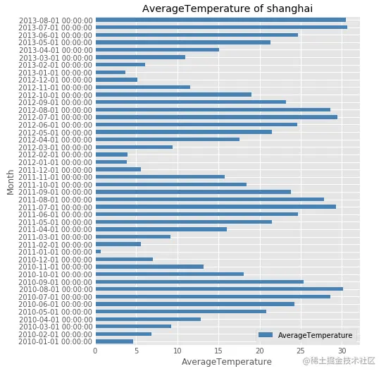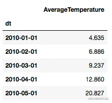 df1 = climate.loc[(climate['Country']=='China')&(climate['City']=='Shanghai')&(climate['dt']>='2010-01-01')]\