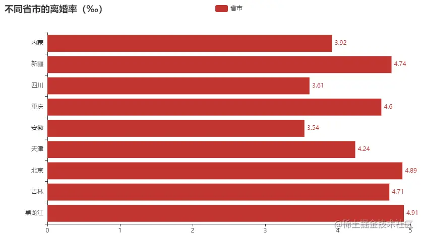 从上图,我们可以清晰的看出,在离婚率最高的十大省市当中,排在比较前面的省份分别是黑龙江与吉林,或许是受到了城镇化以及生育率等多方面因素的影响,毕竟没有孩子的夫妻会比有孩子的夫妻更容易离婚。