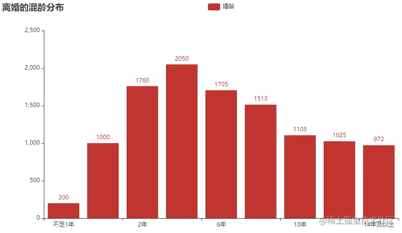 根据上图,离婚的首要原因还是因为生活琐事的繁杂造成的,占到了34.21%,而长期分居两地导致夫妻双方感情变淡也是占据离婚的第二大原因,除此之外,还有感情基础薄弱、家庭暴力、性格差异等原因也是造成离婚的主要因素。那么一般的离婚夫妇都是选择在结婚多少年后选择离婚的呢?