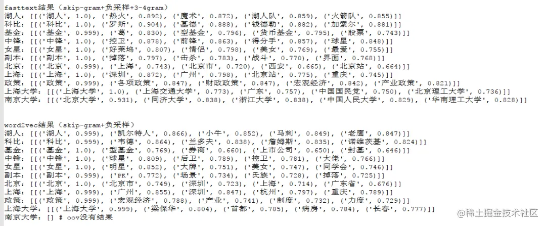 从上图可以看出,fasttext的结果会偏向于具有相似的subword的词,比如基金跟政策两个词的相似词,fasttext的结果会偏向包含词本身的结果,word2vec则不是;另外对于出现频率较低的词,但这个词的subword出现频率不低,则fasttext的效果略好,如上海大学这个词;而对于oov的词,word2vec是给不出结果的,fasttext则能给出相对还可以的结果,如南京大学这个词。