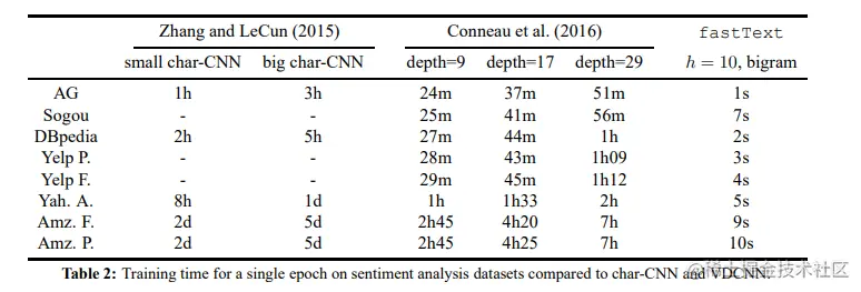 【Bag of Tricks for Efficient Text Classification】论文中提出了一种文本分类模型fasttext,可以作为一种高效的文本分类基准,其精度较高,且速度飞快,使用标准的多核CPU,可以在10分钟内训练包含10亿词的文本,在一分钟内可以对包含30多万类别的500万句文本进行分类(复现代码的速度则远远不如,原代码在工程上做了很多优化)。