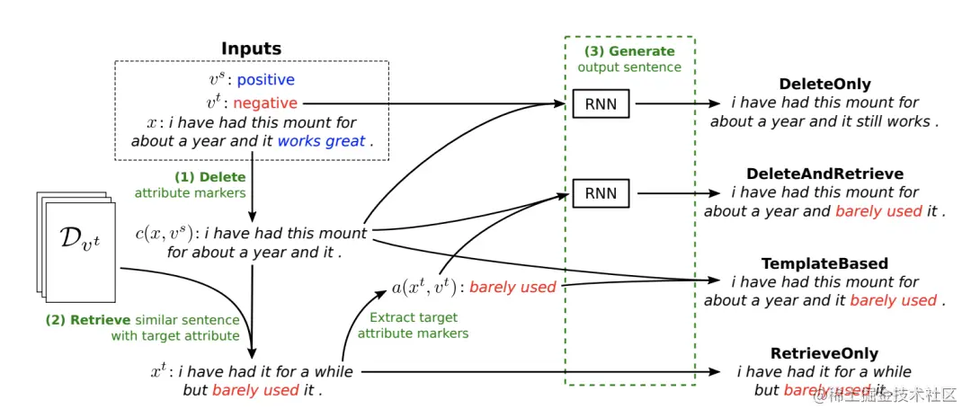 这4种具体的方式也由上图很清晰地展示了出来。值得一提的是 DeleteOnly 和 DeleteAndRetrieve。在删除了具体的 marker 后,作者提出再去根据这个没有情感特定性的句子去从数据中检索出一句最相似但是 attribute 的数值相反(target attribute)的话。检索出的这句话主要用于提取新的 target attribute marker,作为“重写” RNN 的输入之一。