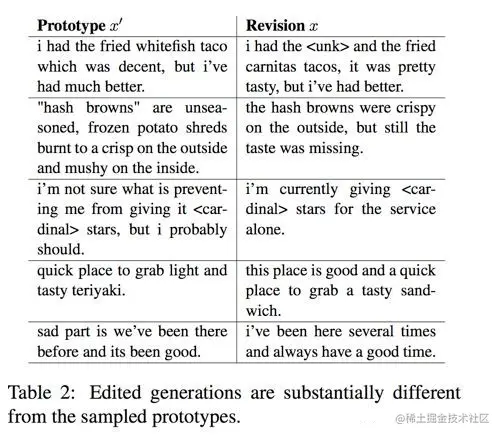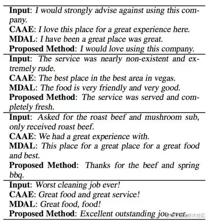 但是也可以看到,这篇工作提出的方法在大幅提高 BLEU 的情况下,ACC 也有一定损失。可以从这个结果看到,想要非常自然地融入 sentiment words 并且不破坏语义和语法,是很困难的事情。看一些直观的转换结果: