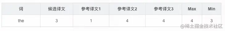 首先统计候选译文里每个词出现的次数,然后统计每个词在参考译文中出现的次数,Max表示3个参考译文中的最大值,Min表示候选译文和参考译文中的最大值的最小值。例如,词"the":