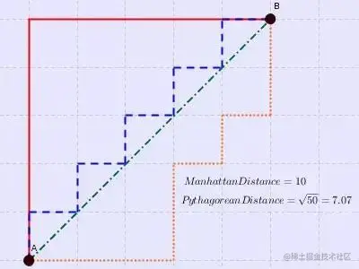 p取1或2时的明氏距离是最为常用的,p=2即为欧氏距离,而p=1时则为曼哈顿距离。当p取无穷时的极限情况下,可以得到切比雪夫距离: