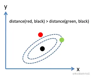 考虑下面这张图,椭圆表示等高线,从欧几里得的距离来算,绿黑距离大于红黑距离,但是从马氏距离,结果恰好相反: