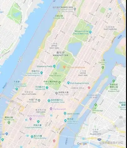 上图中红线代表曼哈顿距离,绿色代表欧氏距离,也就是直线距离,而蓝色和橙色代表等价的曼哈顿距离。通俗来讲,想象你在曼哈顿要从一个十字路口开车到另外一个十字路口实际驾驶距离就是这个“曼哈顿距离”,此即曼哈顿距离名称的来源,同时,曼哈顿距离也称为城市街区距离(City Block distance)。正正方方的曼哈顿的地图: