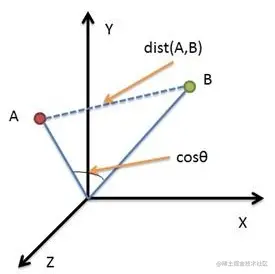 二维空间为例,上图的 和 是两个向量,我们要计算它们的夹角θ。余弦定理告诉我们,可以用下面的公式求得: