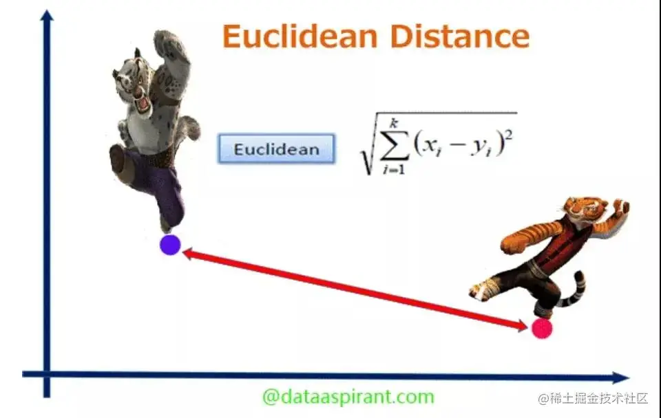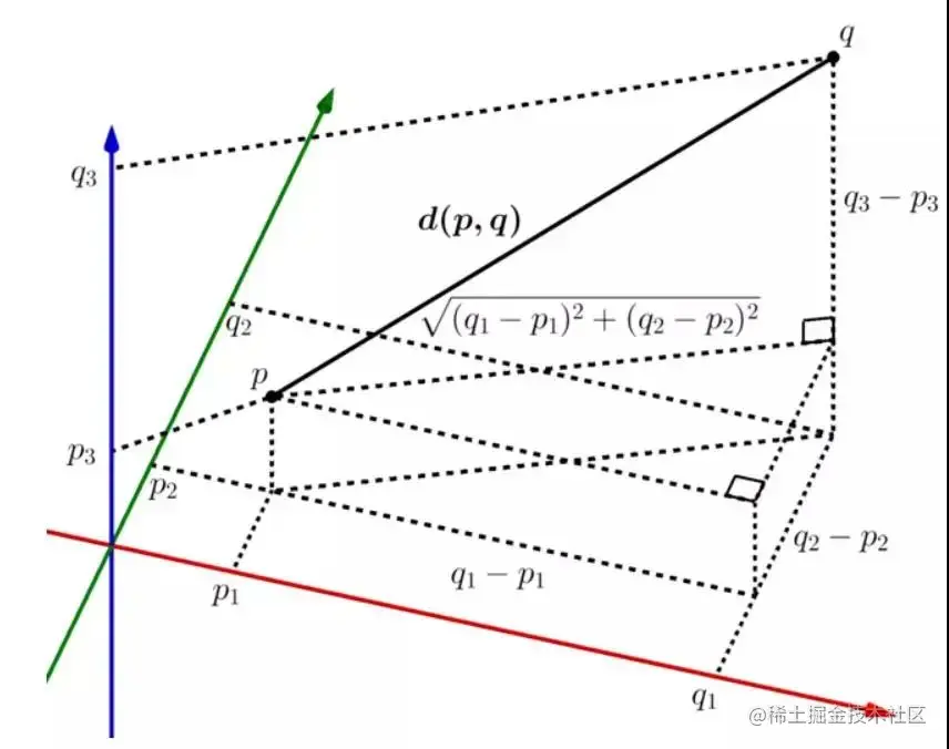 如果我们将两个点分别记作 和 ,则欧几里得距离的计算公式为: