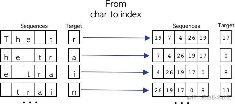 到目前为止,我们已经看到了如何以一种简单的方式生成字符序列。现在我们需要将每个字符转换为其各自的数字格式,为此,我们将使用预处理阶段生成的字典。这个过程可以在下图可视化。