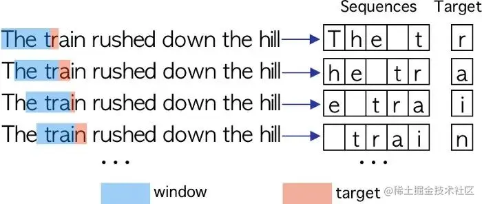 对于我们的模型,我们需要形成一个给定长度的序列,我们称之为“窗口”,其中要预测的字符(目标)将是窗口旁边的字符。每个序列将由窗口中包含的字符组成。要形成一个序列,窗口一次向右得到一个字符。要预测的字符始终是窗口后面的字符。我们可以在图中清楚地看到这个过程。