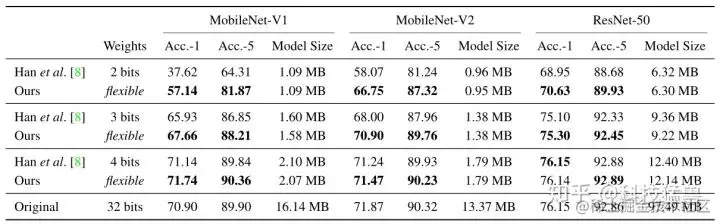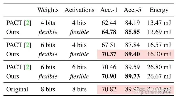 更好的性能。HAQ的能量消耗接近原始的MobileNet-V1模型的一半而几乎没有精度损失,证明混合精度在专门化的硬件设备上的有效性。
