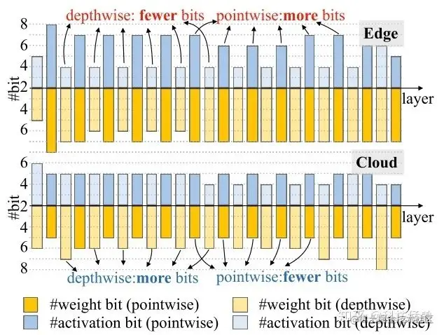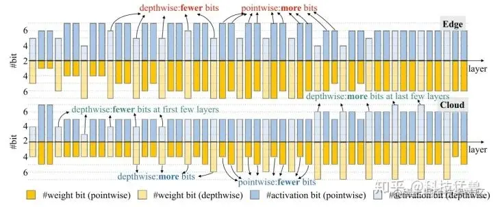 如图32为Model Size-Constrained Quantization的量化可视化结果。HAQ给depthwise convolution 分配了更多的量化位数,给pointwise convolution 分配了更少的量化位数。