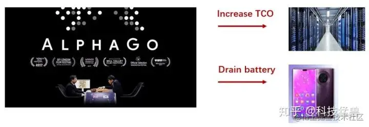 举一个例子: AlphaGo打一局比赛约需要1920块CPU和280块GPU的算力,以及3000$的电费(electric bill),对于端侧设备 (Edge-side devices)来讲,会很快耗尽电池的电量 (Drains Battery) ;对于数据中心来讲会增加总持有成本TCO (Total Cost of Ownership) 。