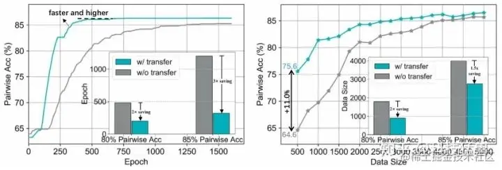 作者尝试了使用Predictor-Transfer技术与不使用的对比,当使用Predictor-Transfer时,左图显示可以获得更快和更高的收敛速度,而右图显示需要更少的数据量。使用Predictor-Transfer时,我们可以使用少于3000个数据点实现85%的pair-wise accuracy (从候选数据集随机选择2个样本,Predictor能够正确识别哪一个更好的比例),而如果没有这种技术,至少需要4000个数据。