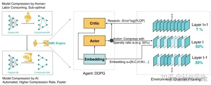 2 再使用AMC为给定的硬件,在给定的条件下搜索最适宜剪枝的策略,以保持高精度。