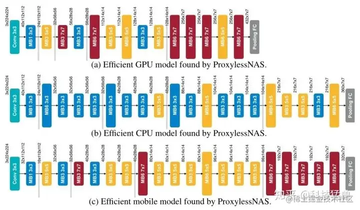 ProxyLessNAS解决的就是这个问题,即希望针对不同的硬件设备专业化神经网络模型,以在目标硬件设备上面获得更好的准确率和较高的硬件效率。