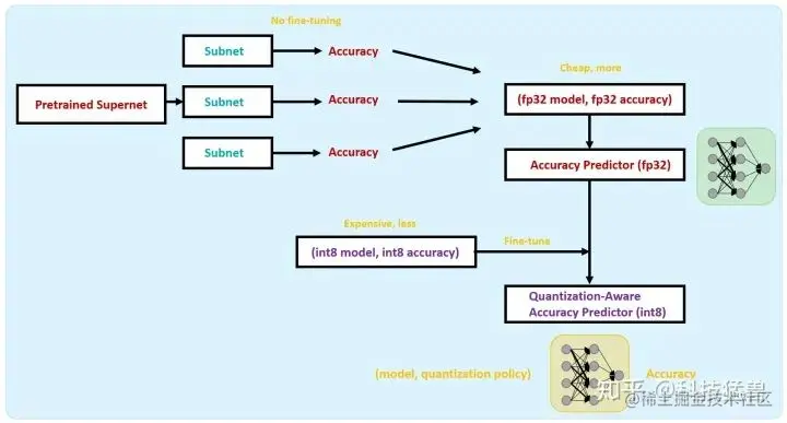 所以,为了减少第1步的计算量,这里借鉴One-Shot NAS的方法:训练一个supernet,其中包含许多个subnet,这些subnet直接继承supernet的权重,不做任何fine-tune,在验证集上评估精确度,即可得到一组数据 (fp32 model, fp32 accuracy) 。这样一来,将计算成本降低至 。利用这些大量的低成本 的数据集 (fp32 model, fp32 accuracy), 我们可以训练出一个Accuracy Predictor (fp32) ,它的输入是模型架构,输出是预测精度。