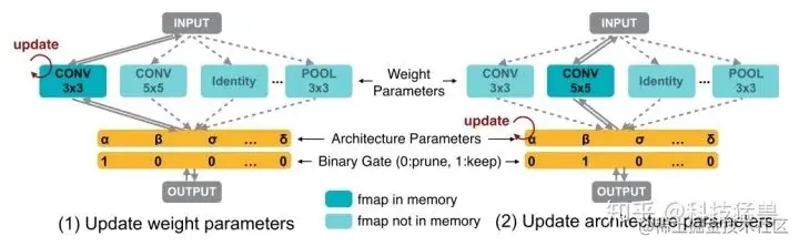 在训练这个超网络的时候,由于操作数量很多,会导致GPU显存不足 (GPU memory explosion),这个问题很常见,因为GPU显存会随着候选操作的数量呈线性增长。解决的办法是每次只激活一条路径进行训练,即:每个操作的架构参数是二值化的。每次更新参数时,只允许一个操作处于激活状态。这样一来,GPU的显存的需求的复杂度就会从 变为 。
