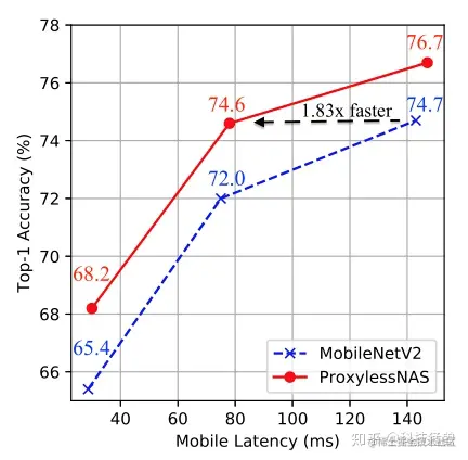 ProxyLessNAS提出的动机就是为了解决以上的3点限制,作者希望能直接在目标任务和硬件 ( target task and hardware)上搜索出最优模型的架构,而避免使用代理Proxy,这解决了上面的第1个问题。同时,ProxyLessNAS不去堆叠重复的单元,每个block都可以被搜索,这解决了上面的第2个问题。最后,ProxyLessNAS还能考虑目标硬件的Latency,这解决了上面的第3个问题。ProxyLessNAS实现的结果如下图: