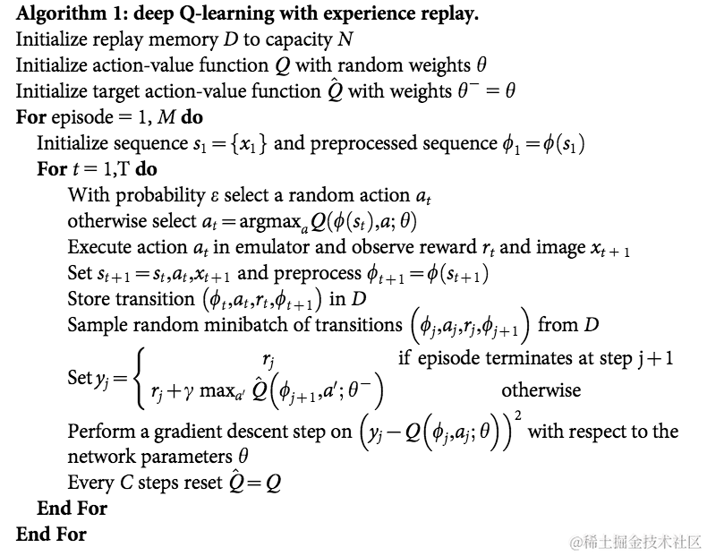 上期详细讲解了DQN中的两个重要的技术:Target Network 和 Experience Replay,正是有了它们才使得 Deep Q Network在实战中容易收敛,以下是Deepmind 发表在Nature 的 Human-level control through deep reinforcement learning 的完整算法流程。