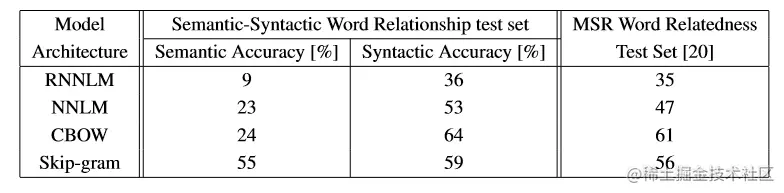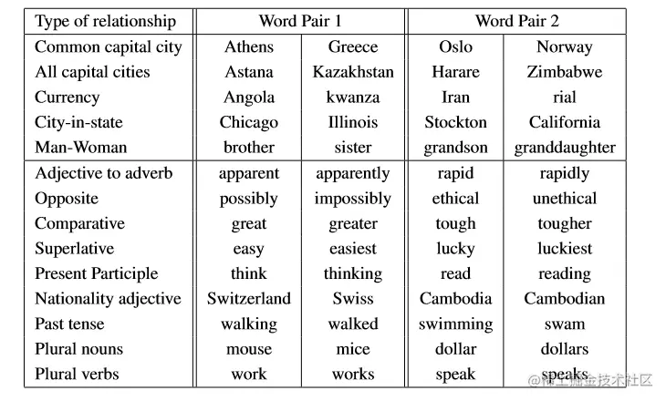 如下表所示,论文中设置了5种语义问题与9种句法问题来测试向量效果,通过类似vec(big)-vec(bigger)≈vec(small)-vec(smaller)的方式来判断。