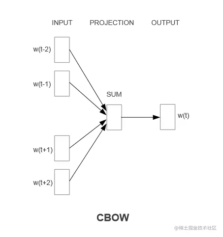 第一种模型结构是CBOW(Continuous Bag-of-Words Model),其思想是利用中心词前面n个词跟后面n个词来预测中心词(n可自定义),如上图所示,用的是前面2个词跟后面2个词预测当前词,输入层直接求和变成投影层,没有其他任何操作,然后直接预测中心词。整体公式可直接表示为: