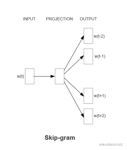 第二种模型结构是Skip-gram(Continuous Skip-gram Model),其思想与CBOW相反:利用中心词预测中心词上下文的n个词(n可自定义),如上图所示,利用中心词预测上下文各2个词,输入层直接等价变化到投影层,然后预测上下文的词。整体公式可以直接表示为: